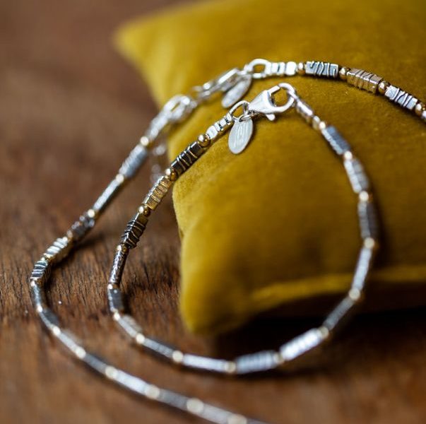 - armband och halsband där material som guld, silver och ädelstenar kombineras med oväntade detaljer